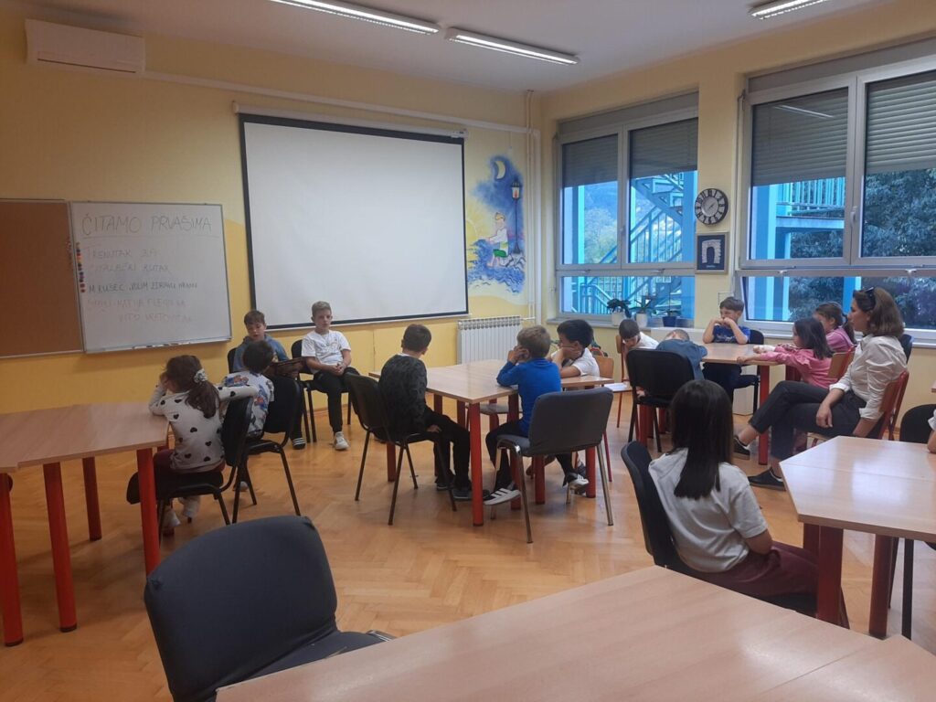 U sklopu projekta “Trenutak za čitateljski kutak” krajem listopada, učenici 4.a razreda Vito Vratović i Matija Flego čitali su prvašima slikovnicu Mladena Kušeca “Zdrava hrana”. Čitanje se odvijalo u knjižnici u sklopu produženog boravka, u pratnji knjižničarke Ines Gržinić Škrinjar i učiteljice Ivane Majer Matković. Cilj projekta je podizanje samopouzdanja i razvijanje navika čitanja učenicima prvog razreda.