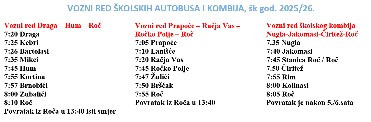Roditeljski sastanak za roditelje učenika prvih razreda matične i područnih škola (osim područne škole Lanišće) održat će se u ČETVRTAK, 4. rujna 2025. godine u 18 sati u matičnoj školi u Buzetu. Nakon zajedničkog dijela u dvorištu škole, odvijat će se pojedinačni...