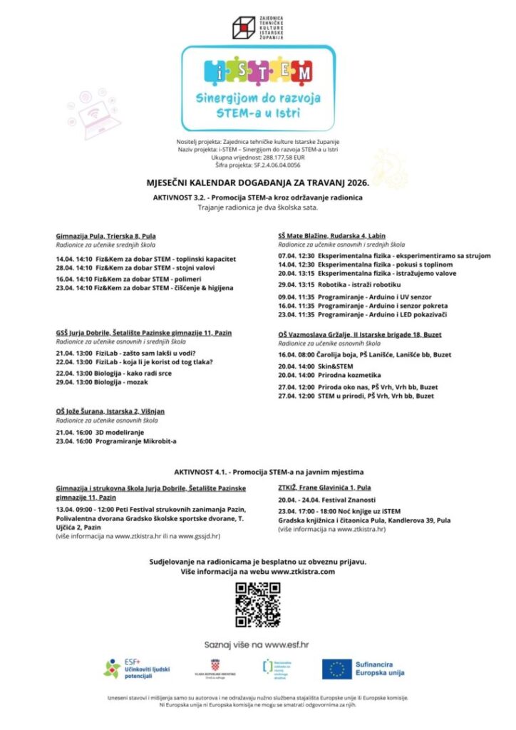 Zajednica tehničke kulture Istarske županije, u sklopu projekta „i-STEM – Sinergijom do razvoja STEM-a u Istri (SF.2.4.06.04.0056)“, otvara vrata novom ciklusu besplatnih radionica! Pozivamo sve učenike osnovnih i srednjih škola da nam se pridruže i kroz praktičan rad, igru i najmoderniju tehnologiju istraže fascinantan svijet znanosti i tehnike.