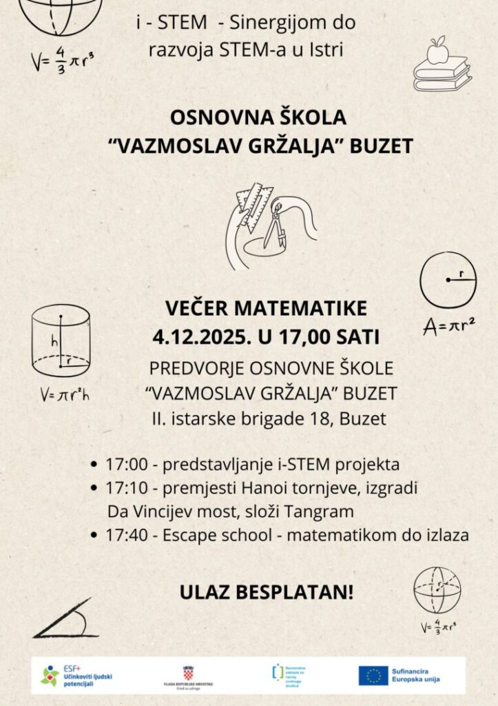 Zajednica tehničke kulture Istarske županije i Osnovna škola “Vazmoslav Gržalja” Buzet s velikim vas zadovoljstvom poziva na izuzetno interaktivnu Večer matematike, manifestaciju osmišljenu kako bi učenici i njihovi roditelji otkrili zabavnu i primjenjivu stranu matematike i logike! Javna manifestacija održava se u sklopu Aktivnosti 4.1. projekta i-STEM – Sinergijom do razvoja STEM-a u Istri (SF.2.4.06.04.0056) sufinanciranog iz Europskog socijalnog fonda plus i Državnog proračuna RH.