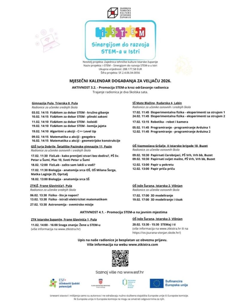 Zajednica tehničke kulture Istarske županije, u sklopu projekta „i-STEM – Sinergijom do razvoja STEM-a u Istri (SF.2.4.06.04)“, otvara vrata novom ciklusu besplatnih radionica! Pozivamo sve učenike osnovnih i srednjih škola da nam se pridruže i kroz praktičan rad, igru i najmoderniju tehnologiju istraže fascinantan svijet znanosti i tehnike.